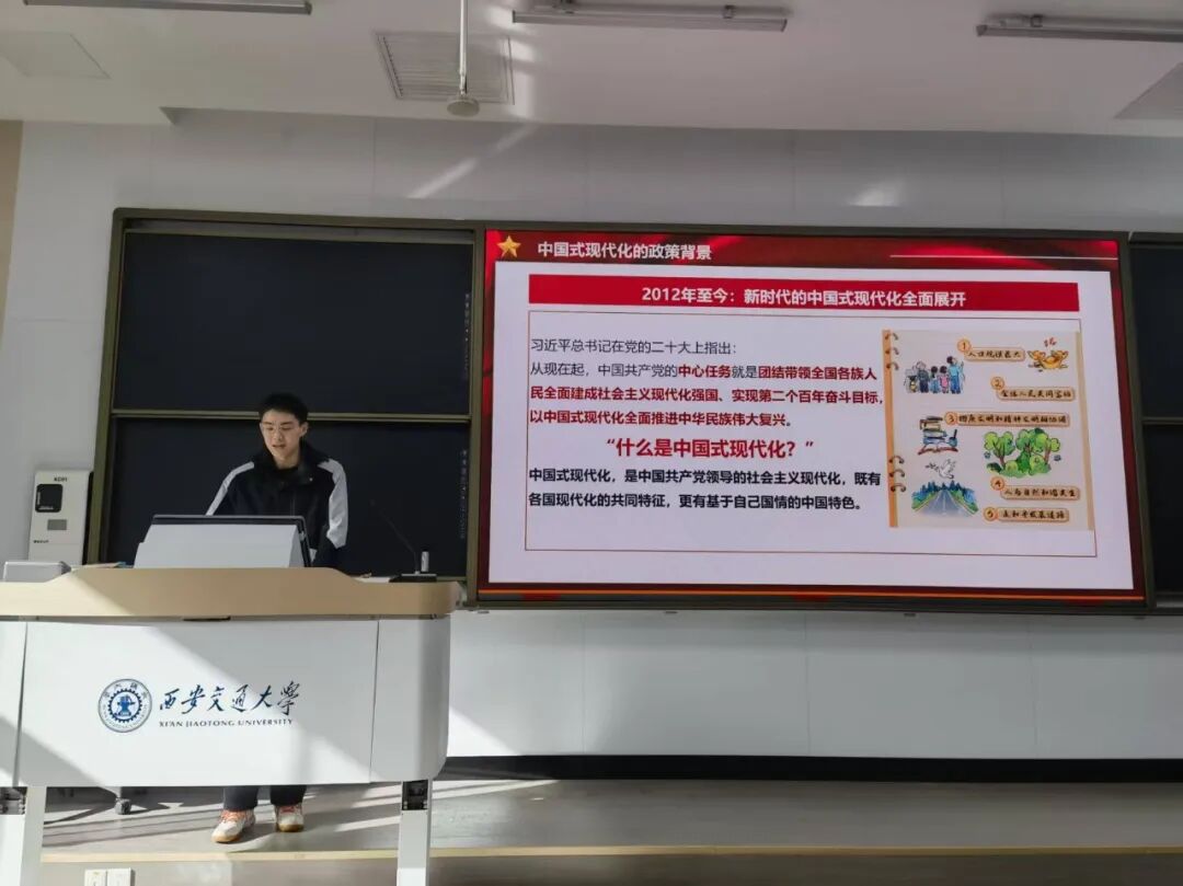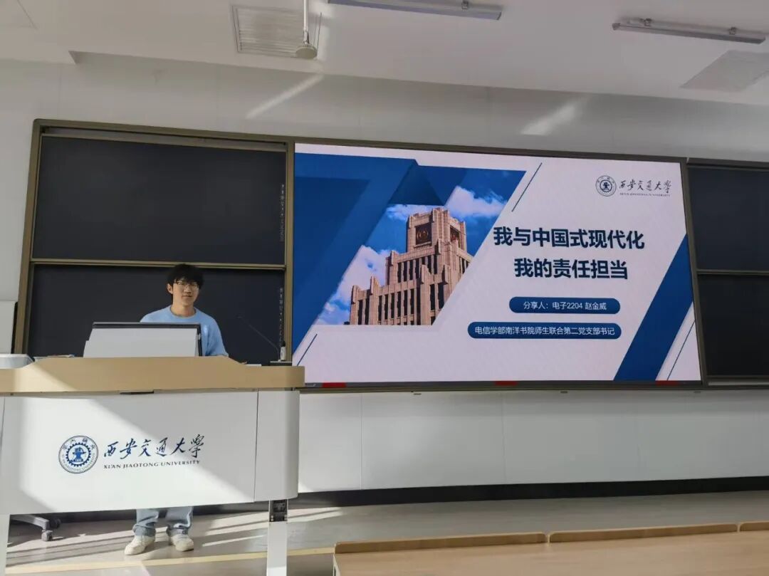 电信学部南洋书院师生联合第一党支部书记符家瑞以“我与中国式现代化:政策引领与时代担当”为题率先分享。他系统梳理了中国式现代化的理论体系与核心要义,结合当前国家发展战略,阐述了新时代青年所肩负的历史使命,号召支部成员将个人发展融入国家进程。